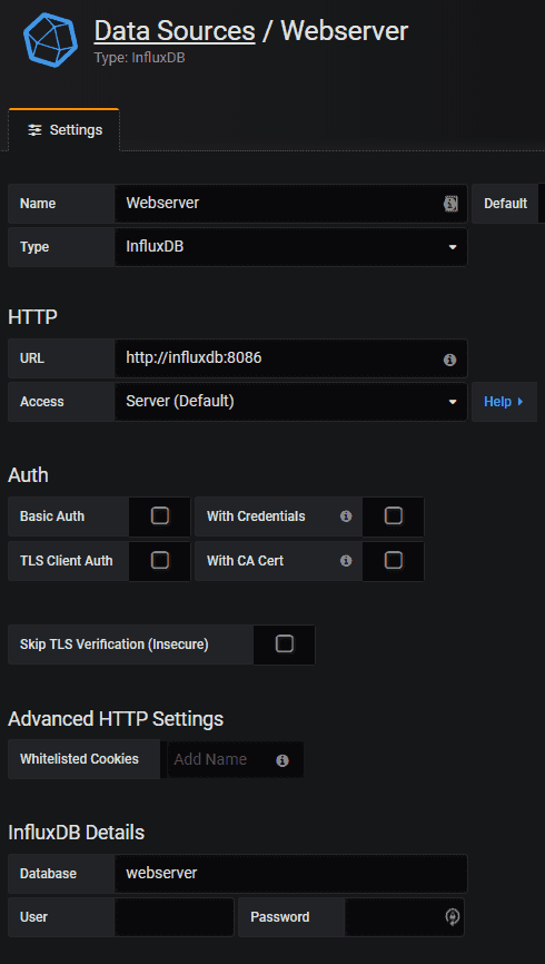 The first thing we need to do is to add a data source, so Grafana knows where our data is located. We enter http://influxdb:8086 as the URL and “webserver” as the database name as shown below.